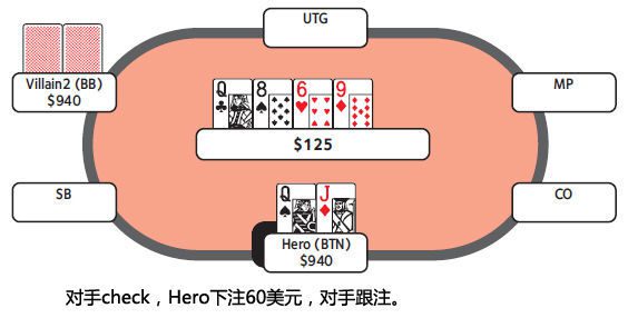 Hero现在输给了AT、AJ、QJ、22、KT和方块同花,而对手极少将Qx和Jx转变成诈唬,这是一个很简单的弃牌。