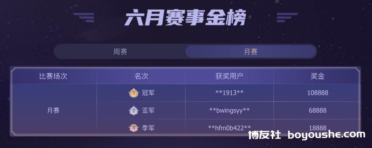 六月大赛开赛以来热度只增不减,除6月4日、11日、18日三场周赛持续火爆外,6月25日作为首个周赛与月赛合并的比赛日更是盛况空前,当天就吸引了逾7000人参赛。月赛冠军108888元的现金大奖,更是在经历了近30分钟的厮杀之后,被用户**1913**一举拿下,亚军68888元与季军18888元的丰厚奖励也纷纷被玩家收入囊中。该场月赛一经结束,26万超大奖池便迅速派发完毕,500人超大奖圈人人获利,一时壕气万丈羡煞旁人。