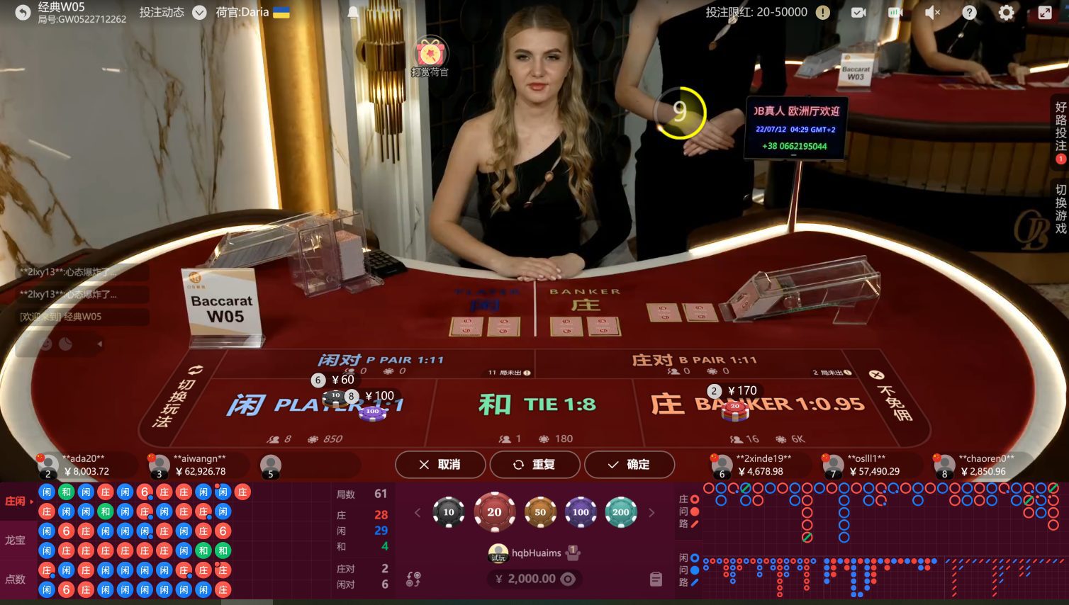 欧洲厅目前已上线6张百家乐桌台,其它游戏将持续推出。欧洲厅的游戏桌台全面运用双镜头模式,远景近景自动切换,下注环节时使用远景模式,开牌时使用近景模式,玩家可更清晰直观地查看开牌结果,高度还原游戏真实性。与此同时,全厅支持电话验证、数字验证,玩家可随时随地进行场馆验真。双镜头技术及验真技术等高新技术的全面应用,充分加强了玩家对场馆的信任度。