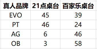 从这个问题可以推断友商不太了解亚洲以及全球真人市场的发展需求。分别以欧美真人代表品牌及亚洲真人代表品牌为例,从桌台数量上可以直观地看出欧美及亚洲市场的差异。