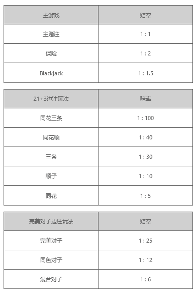投注不同的游戏玩法可获得不同的赔率。主游戏中保险赔率是赌注的2倍,Blackjack是赌注的1.5倍;21+3边注玩法中,中奖机率越低赔率越高,同花三条赔率高达100倍;完美对子赔率高达25倍,均是非常高的比例。