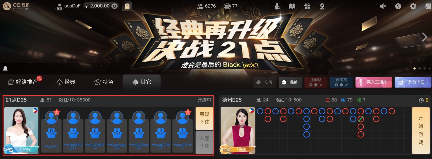 21点游戏在“其它“游戏版块,玩家可选择”入座下注“或”旁观下注“