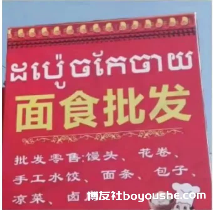 一家中餐招牌店,“柬食尚”是不是听着挺高大上,但柬语写的却是“卖柬埔寨肉店”。