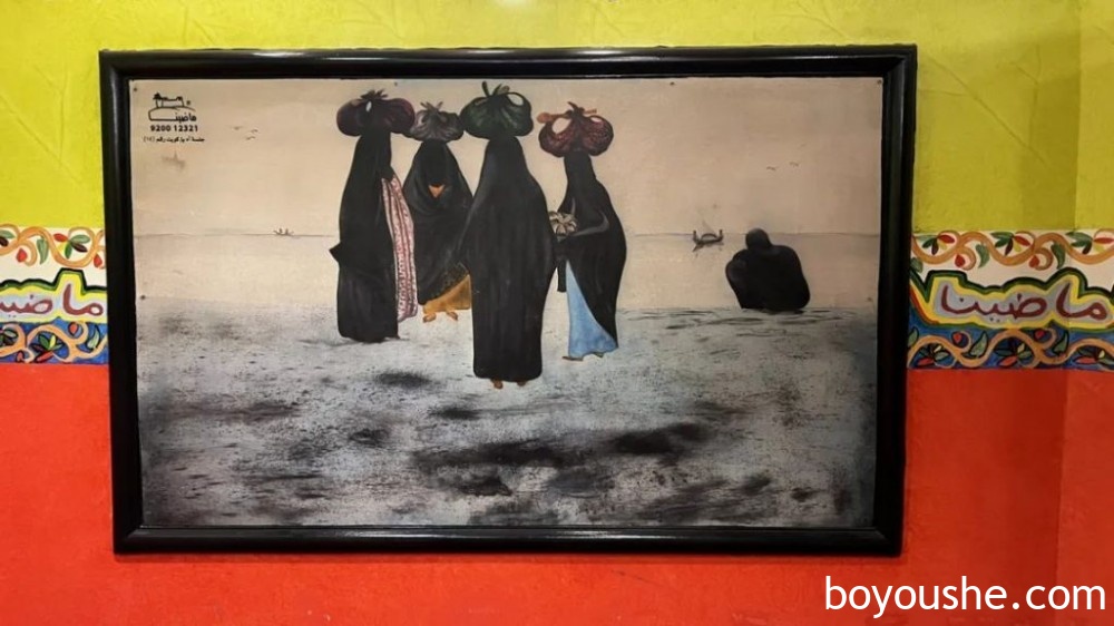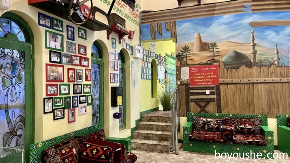 Khaneen餐厅是科威特风格,位于沙特国王大学附近的“U Walk”美食购物广场,主色调为蓝色,让人一下子就能记住。餐厅内部装饰强调复古传统,在左侧放置了一辆甲壳虫复古车,墙上挂有科威特六十七年代的名人照片,右侧则为挂满搪瓷壶的橱柜。餐厅中间的置物架上还放有老旧收音机、椰枣树枝条编织的容器等等。