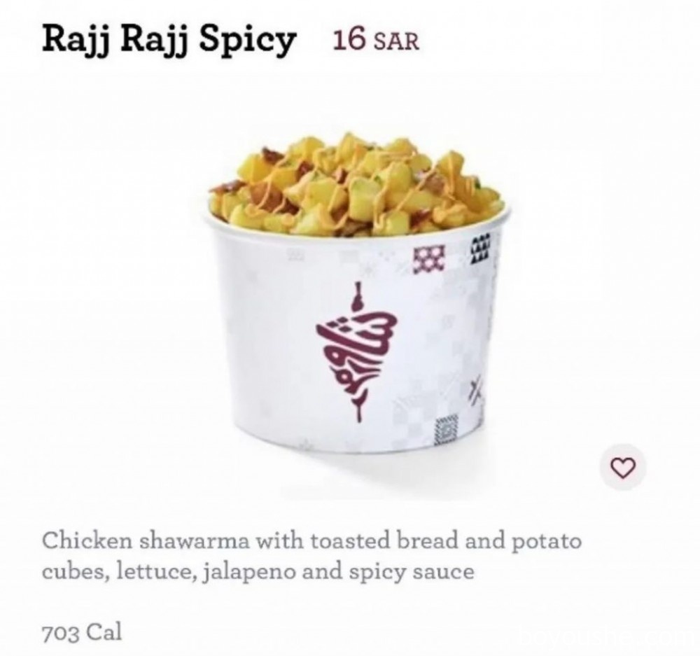 Rajj Rajj Spicy(16里亚尔)和Althaybah Meal(32里亚尔)是店内我比较喜欢的两道食物。这里还有全牛肉的Shawarma和全鸡肉不带饼的Shawarma。这家快餐相对还是比较实惠的,但沙特物价近几年也上涨了很多,这个品牌店的Shawarma比其他街边杂牌的来说还是要贵很多。