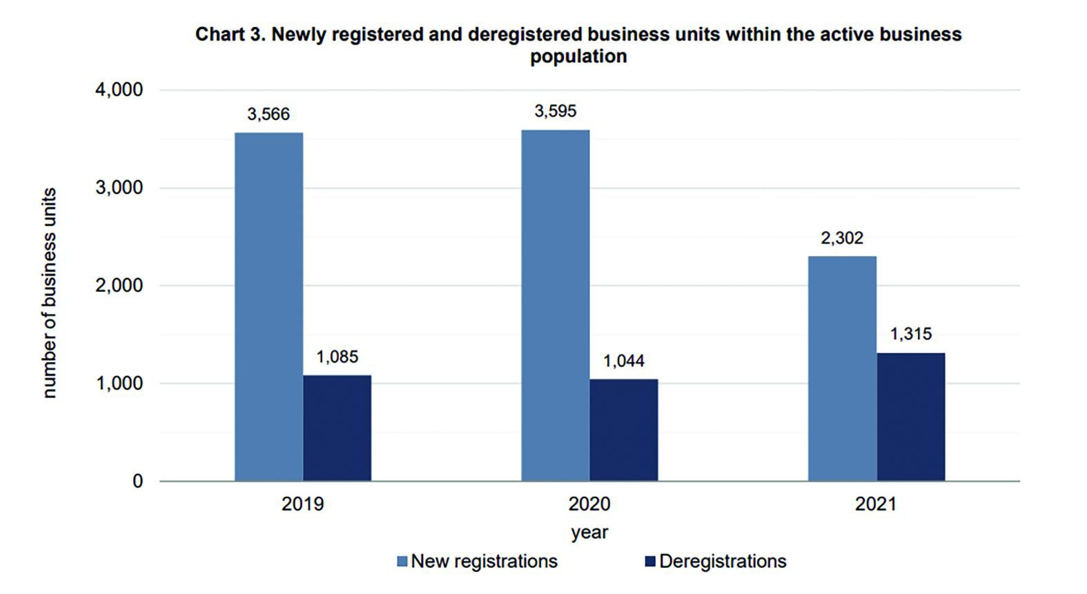 但在 2021 年录得显着下降,当时统计局注册的新企业较少,注销的旧企业较多。