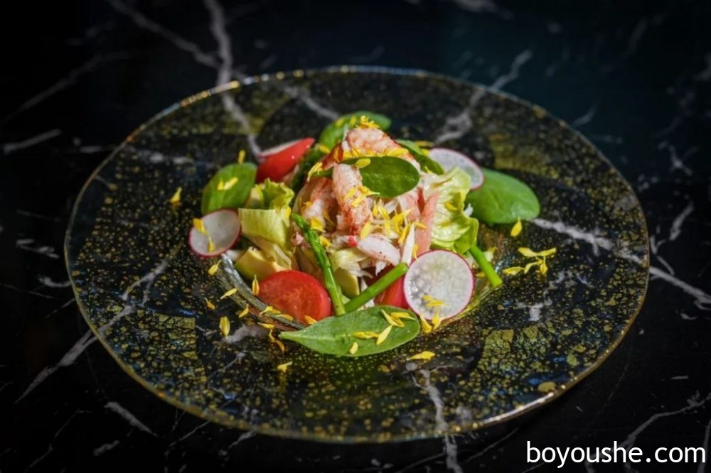 蟹肉沙拉用的是日本蟹的蟹肉,搭配的芦笋水萝卜番茄和生菜都是相对清淡的,和带着果酸清香的特调酱醋一混合便提出了蟹肉的鲜来,黑色鎏金的盘配上提香增色的菊瓣带出了一种典雅的感觉。