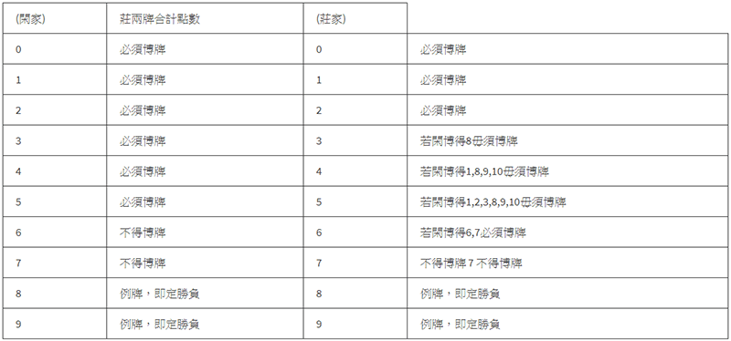 庄闲任何一方两牌合计8、9点为例牌, 对方不须博牌, 即定胜负。