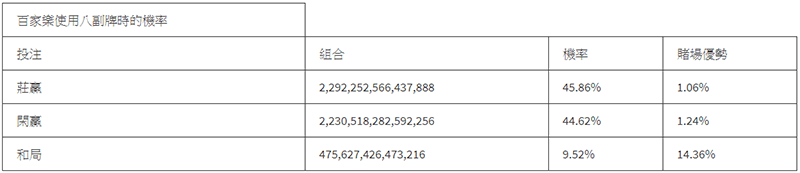 百家乐除了和局的投注外, 是赌场中最佳投注的赌博游戏。下表是显示所有可投注专案中的赌场优势. 通常和局赔率是1赔8,但有时有1赔9