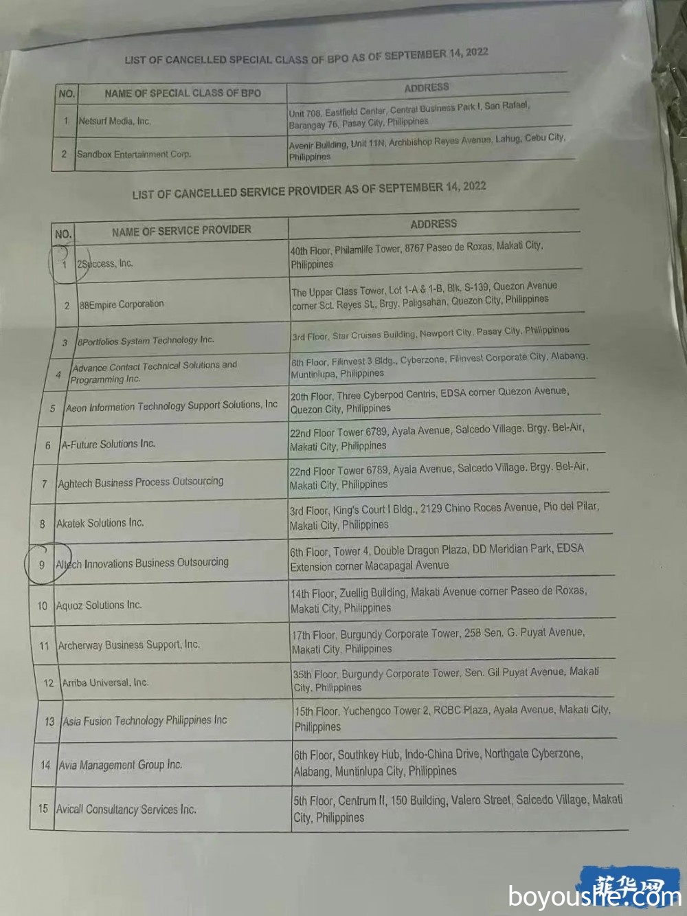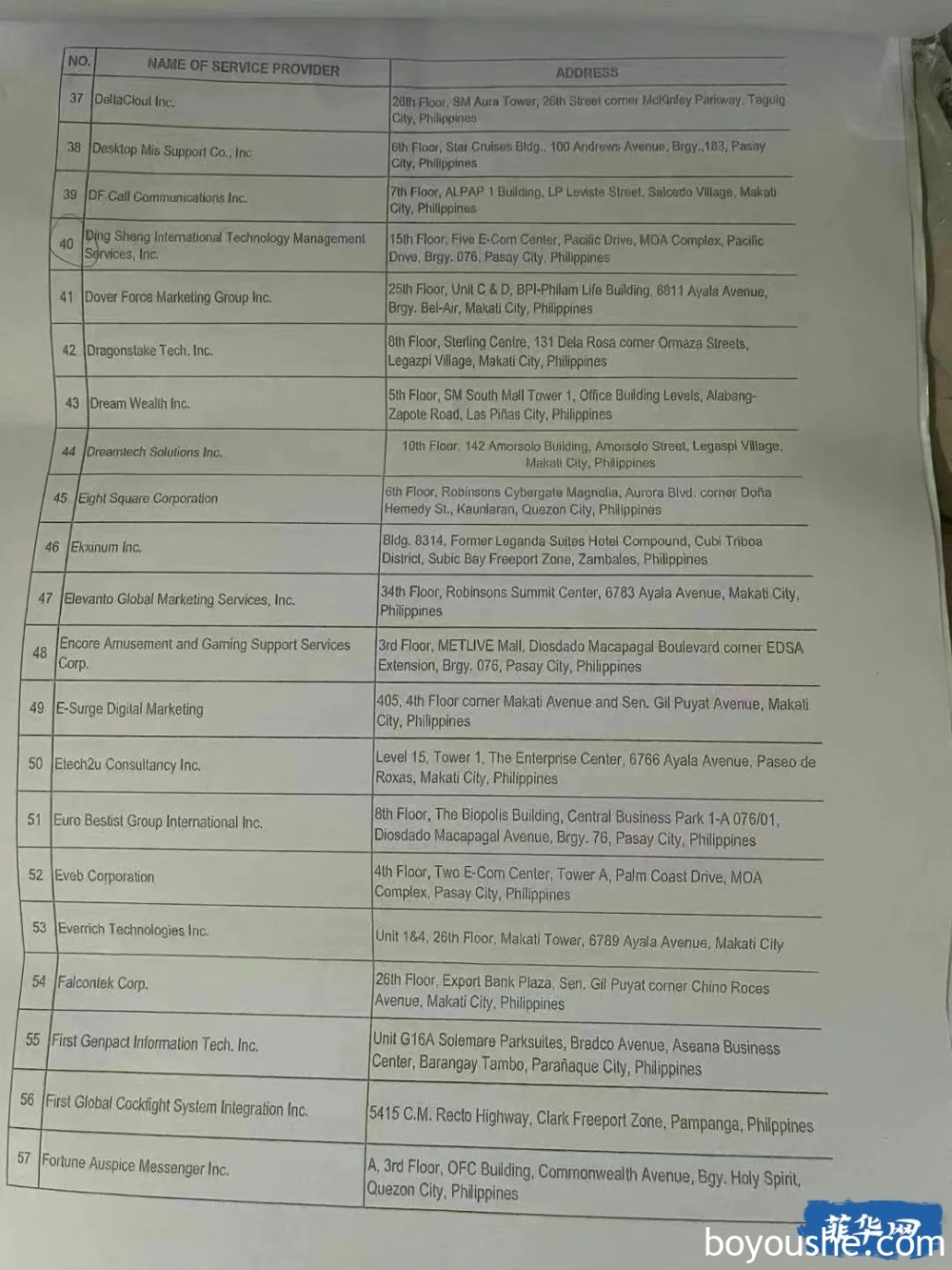 被菲律宾政府取消网络菠菜牌照的公司清单