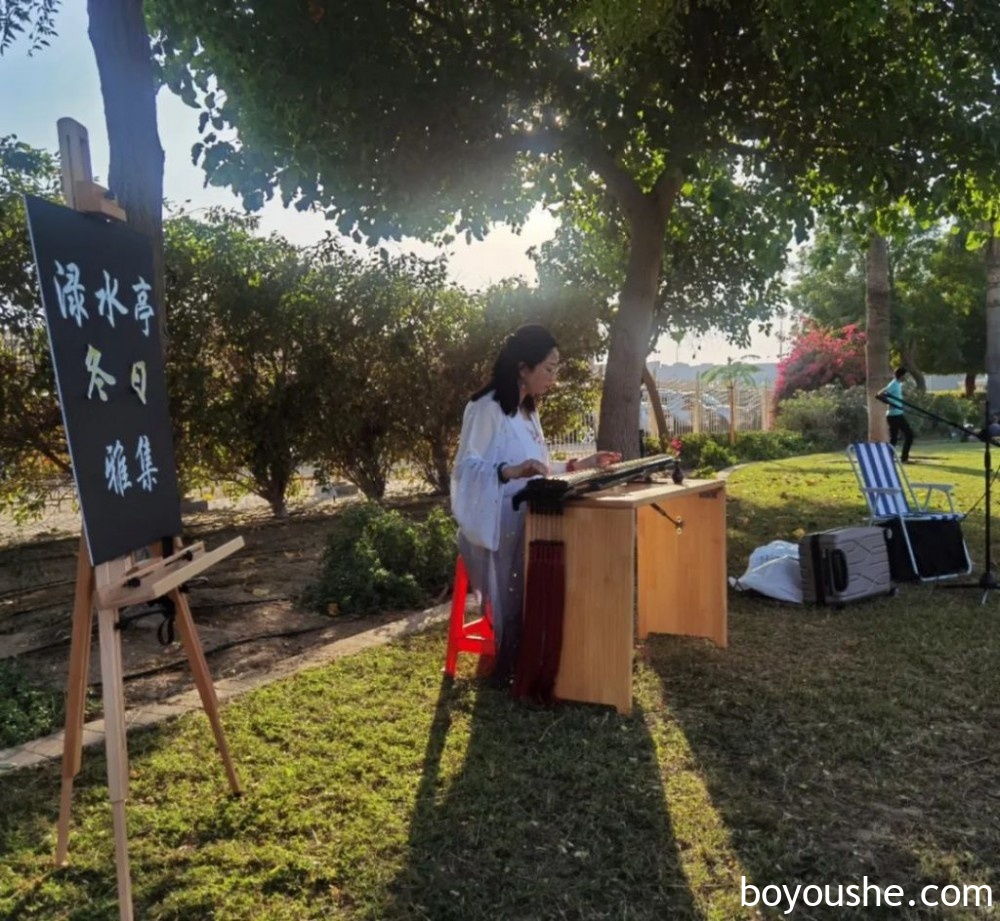 迪拜华侨董娟师从古琴演奏家、教育家、非遗蜀派古琴代表性传承人俞秦琴女士,于2018年在迪拜创办渌水亭琴茶社。社以渌水为名,源自唐代白居易《琴茶》诗:“琴里知闻唯渌水,茶中故旧是蒙山。”