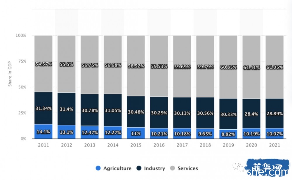 2011-2021菲律宾三大经济部门占菲律宾GDP的比重