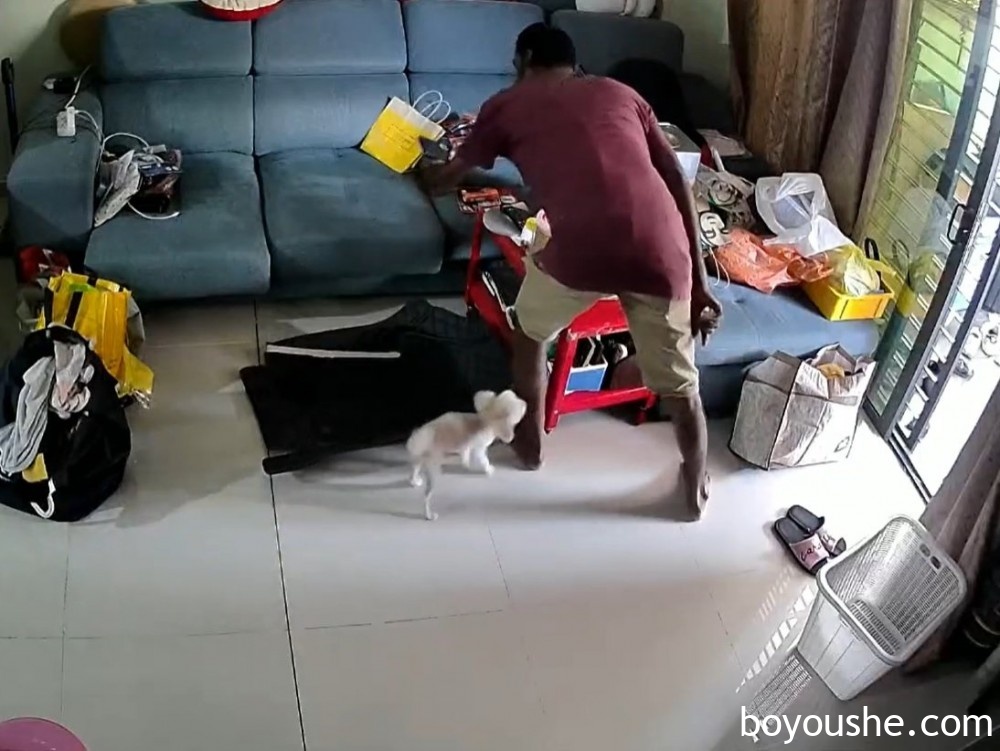 视频中,小偷进入客厅后拿走放置在沙发上一台价值7000令吉的三星手机,惟过程中家中宠物狗却没有吠叫。