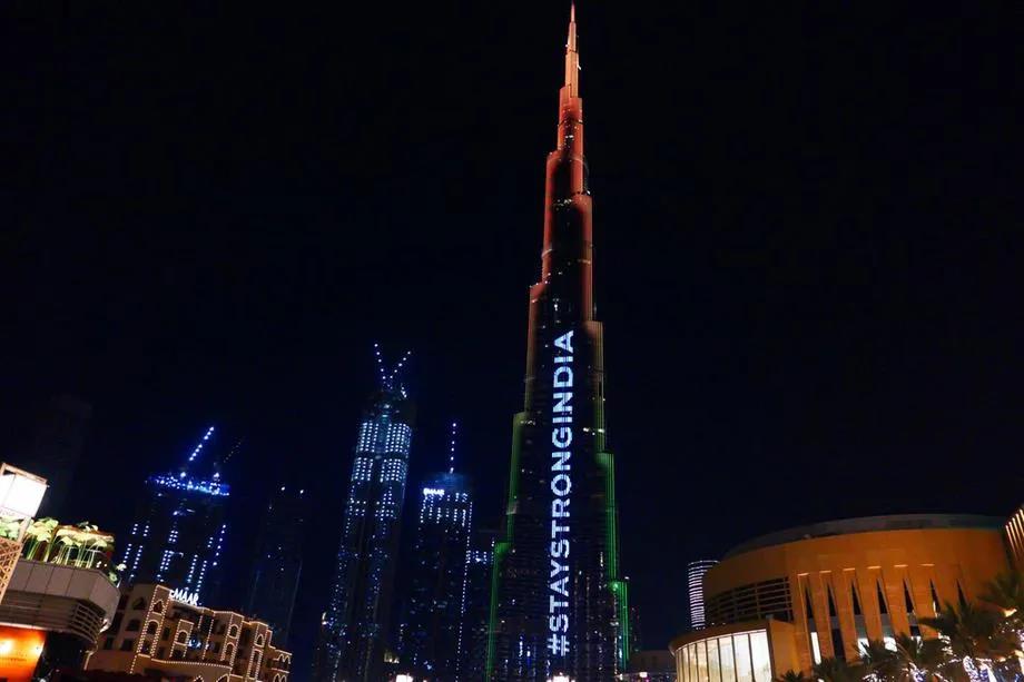 周日晚上,迪拜点亮了哈利法塔以声援印度——该国正努力应对日益严重的新冠疫情危机。