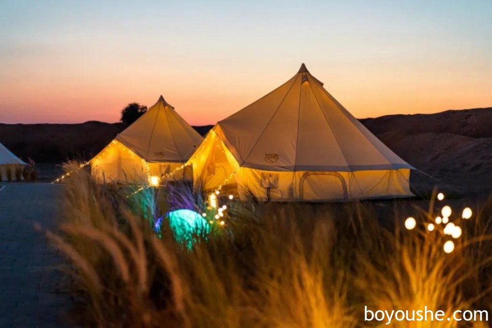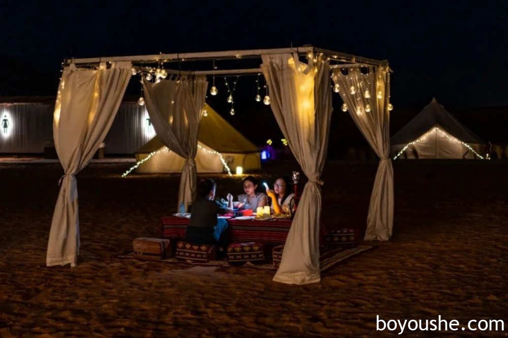 晚上营地里被暖黄色的小灯串打亮,氛围感拉满,夜晚抬头看看漫天星空,或与朋友聊聊天又或发发呆。睡意朦胧时,洗个澡,走进沙漠中温馨干净的帐篷里的暖和被窝……