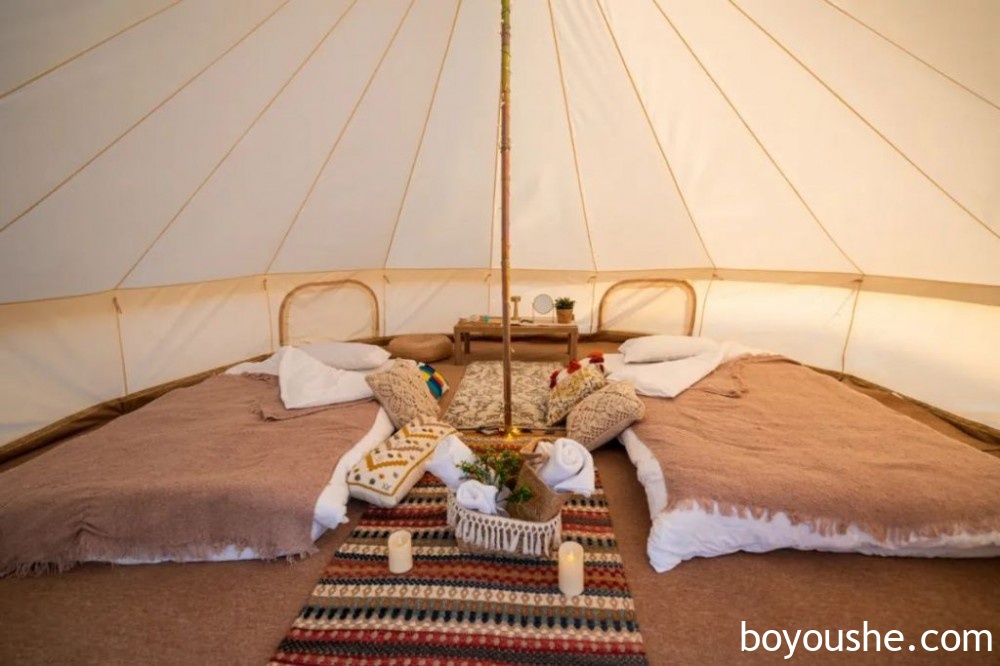 帐篷里面的空间比我想象中的大很多,可以放下两张大床还有很多空间。里面的布置也非常温馨,Ins风的物件繁多,很适合拍出美照。设施也是一应俱全,无论是手机充电线,一次性拖鞋,厚毛毯,浴巾等全都提供,甚至还有一张梳妆桌,基本就是酒店的配置了。