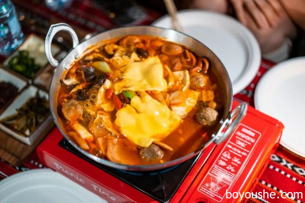 我们今天过来刚好营地里来了一个韩国旅游团,所以今晚的饮食也就选定是韩式部队锅啦!
