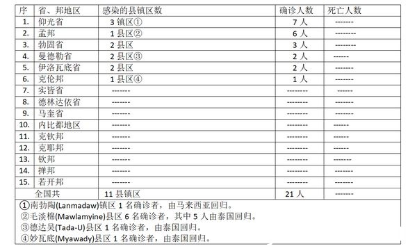缅甸卫生部于11月30日下午4时发布公告,全国各省邦,11月29日的确诊人数21人无死亡人员,具体数据如下表: