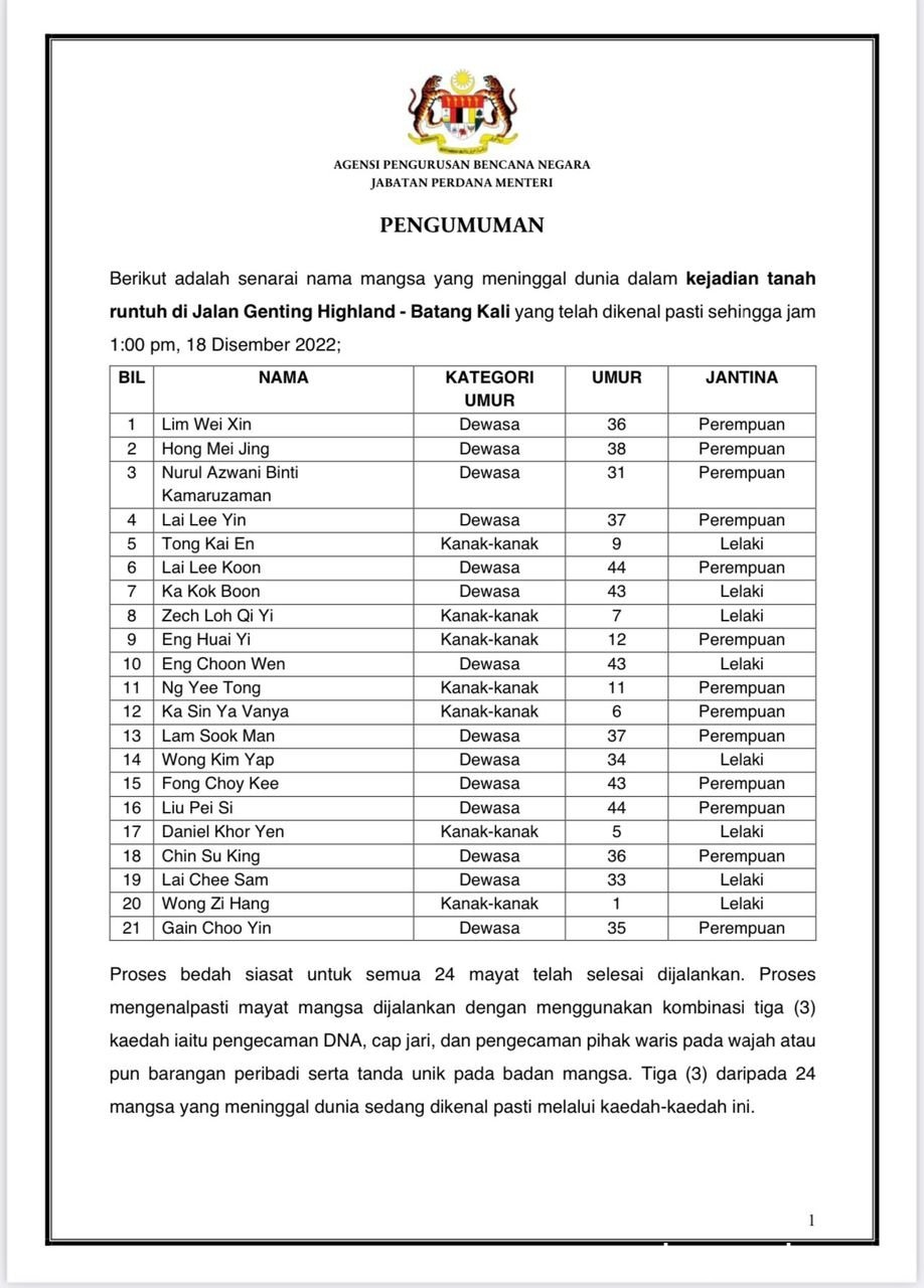国家天灾管理机构今日发文告表示,截止今日下午1时正,峇冬加里营地土崩事件中有21名罹难者身份已确定,另有3名罹难者则仍在检测中。目前确定身份的罹难者中有14名成人和7名孩童。