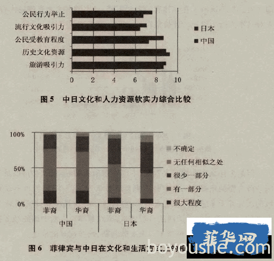 中国人移民菲律宾的历史悠久,根据考古学上的发现,很可能早在公元前的中国人移民菲律宾的历史悠久,根据考古学上的发现,很可能早在公元前的汉朝,中国居民便已迁居菲律宾群岛。目前关于菲律宾华人的人口数量,并没有非常科学和权威的统计数据,大致认为在120万至150万之间。根据台湾“侨委会”在2011年7月的估算,截至2010年底,华人人口约145.9万,占菲律宾总人口的1.55%。实际上,由于华菲人通婚普遍,很难在菲律宾找到没有中国血统的菲律宾人,一种说法是20%的菲律宾人都拥有中国血统。中华文化对菲律宾的影响可谓非常深远,无论是菲律宾语言、风俗习惯还是饮食,都能找到中华文化的痕迹。因此,较日本而言,无论是华裔还是菲裔,大部分菲律宾人都认可菲律宾和中国在文化与生活方式上拥有很多的相似之处(见图 6),尽管这一比例依然低于美菲之间的相似度。