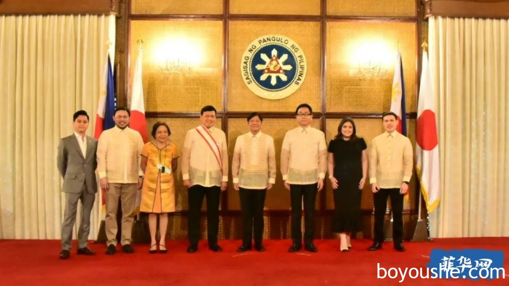 11月25日,因在日本与菲律宾2008年达成“经济伙伴关系协定”和“税收协定修正案”以及2011年“技术合作协定”等方面发挥重要作用,日本天皇授予菲律宾前参议院议长、超级富豪维拉(左四)旭日勋章。小马科斯及维拉的家人均到场观礼。
