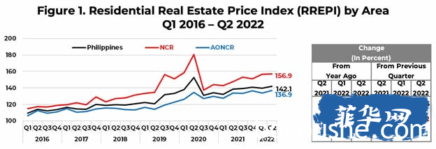 2016年以来菲律宾房地产市场趋势图,其中红线是马尼拉大都会,蓝线是马尼拉以外,黑线是菲律宾平均值。