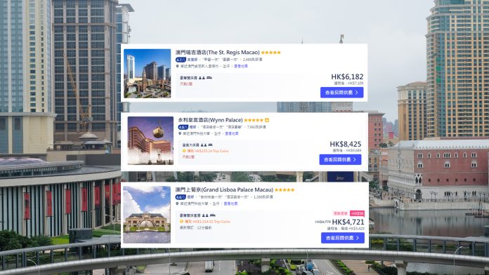 去年春节黄金周由于受邻近地区的疫情影响,酒店入住率只有六成三,房价方面平均每晚1,000多元左右,即使是五星级酒店亦不超过1,200元;不过随着近日澳门「开关」旅客持续回升,路氹区酒店在新春假期的预订几乎已满,虽然未至于如疫情前「一房难求」,甚至出现炒卖情况,但房价已重回较合理的水平,Allin于内地旅游平台「携程」、「飞猪」发现,银娱、新濠及美高梅旗下位于金光大道的酒店基本已满订,而上葡京、喜来登、瑞吉、永利皇宫(只剩零星单日客房),只有极小量的客房,且平均每晚达5,000元以上,部分更逾8,000元。