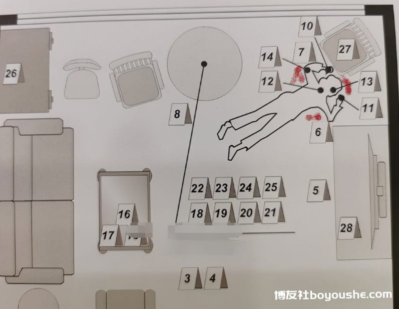 据酒店清洁人员的描述,在进房时,发现女子尸身俯卧在酒店房间地上,颈上有一条浴袍腰带缠绕,口流黑血,手脚有多处青紫瘀伤。